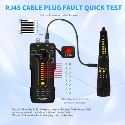 The multifunction Wire Tracker is designed for maintenance and installation of cable, cable tracer in one equipment. The unit supports detect the near-end, mid-end and far-end fault point of RJ45 cable connector. UTP port support max 60V withstand voltage, the wire can be traced directly in connection with PoE switch. Installers and engineers take the all in one cable tester, making working conditions safer and increasing productivity.