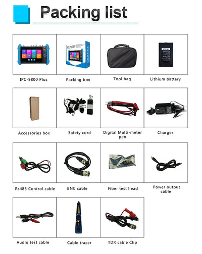IPC9800-CLMOVTADHS Model: support 8MP TVI / CVI 8MP /8MP AHD camera test , 1080P SDI camera test , HDMI input , HDMI output ,cable tracer, Multimeter, optical power ,TDR cable tester , red laser soucer